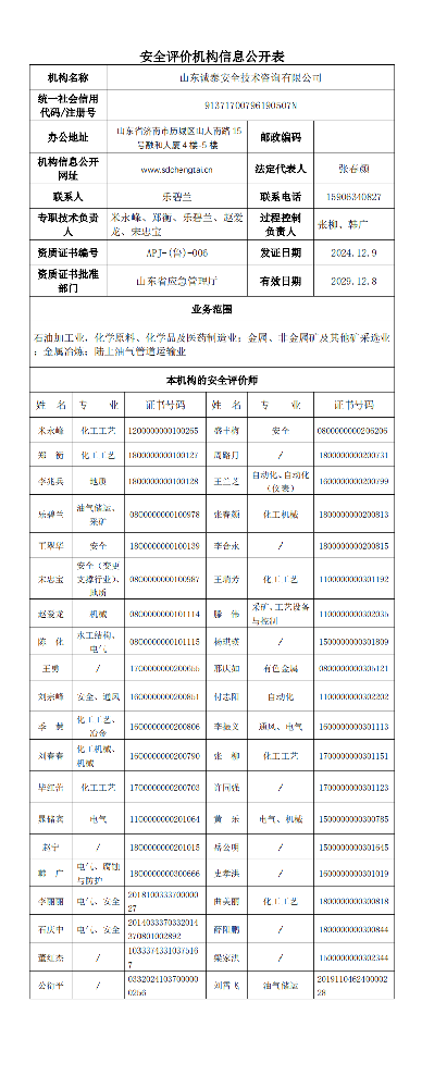 山东诚泰安全技术咨询有限公司机构信息及人员信息公开机构名称 山东诚泰安全技术咨询有限公司统一社会信用代码/注册号 91371700796190507N 办公地址 济···